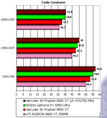 - Code Creatures Benchmark Pro (CodeCult)  игровой тест, демонстрирующий работу платы в DirectX 8.1, Shaders, HW T&L.