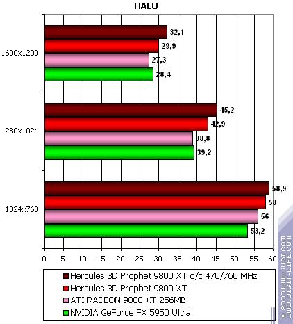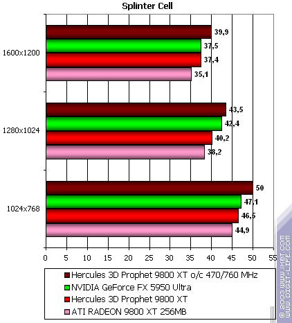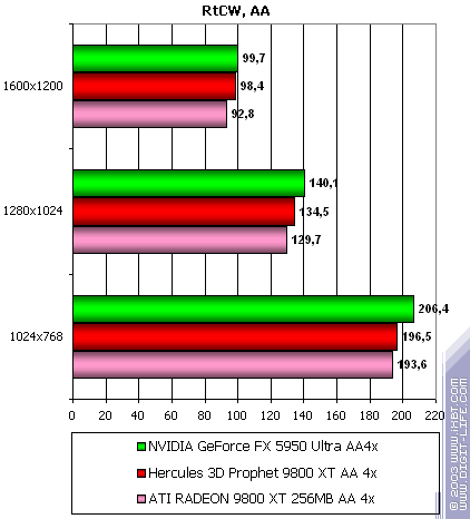 Самые легкие режимы без АА и анизотропии: 9800XT от Hercules чуть выигрывает (но в целом паритет)