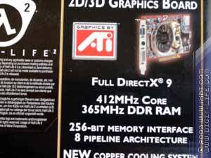 размещенной в 8-ми микросхемах на лицевой и оборотной сторонах PCB. Микросхемы памяти производства Hynix (маркировка HY5DU573222). Время выборки у микросхем памяти 2,5 ns, что соответствует частоте работы 400 (800) МГц, память же работает на частоте 365 (730) МГц. Частота работы GPU  412 MHz. Интерфейс обмена с памятью  256 бит. |   |
