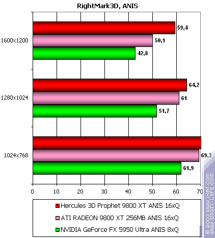 При включенной анизотропии: Hercules R9800XT немного отстал