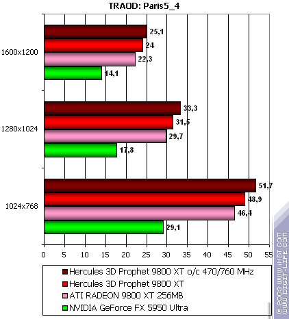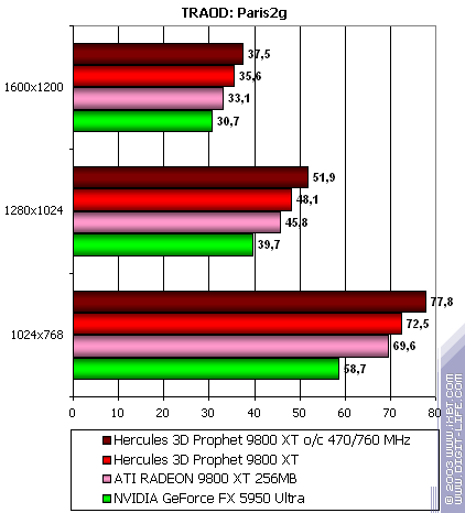 Собственно, результат в этом тесте ожидаем: тут одни шейдеры, и Hercules R9800XT легко выигрывает раунд.