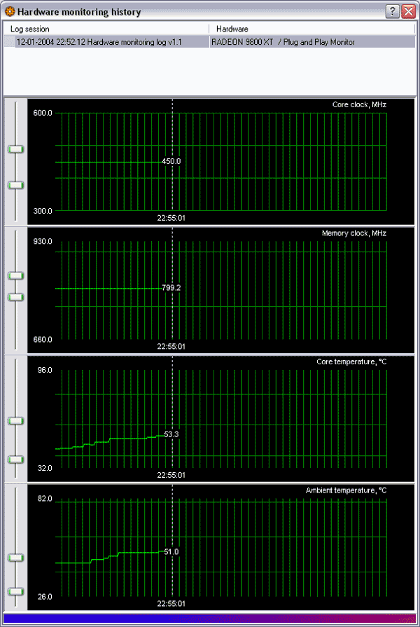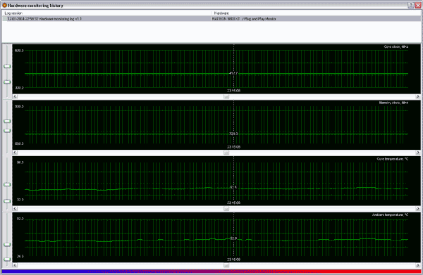 Заметим, что при работе на штатных частотах (без какого-либо дополнительного охлаждения) температура изменяется очень мало, находясь в пределах 50-52 градусов. Мы помним, что при активной функции OverDrive повышение частот до 432 МГц идет только в случае температуры чипа не выше 35 градусов. И в остальных  только до 418 МГц (а при температуре свыше 55 градусов идет снижение до номинала). Судя по вышеприведенному графику изменения температур, OverDrive тут фикция, потому что даже при легкой нагрузке температура уже выше 50 градусов.