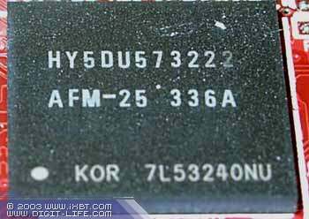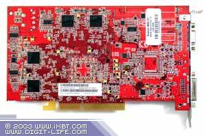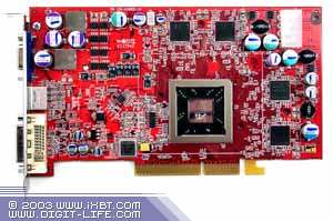 | Kарта имеет интерфейс AGP x8/x4, 256 МБ памяти DDR SDRAM , размещенной в 8-ми микросхемах на лицевой и оборотной сторонах PCB. Микросхемы памяти производства Hynix (маркировка HY5DU573222). Время выборки у микросхем памяти 2,5 ns, что соответствует частоте работы 400 (800) МГц, память же работает на частоте 365 (730) МГц. Частота работы GPU  412 MHz. Интерфейс обмена с памятью  256 бит. |  |