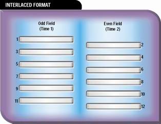 Рис.1. Наглядное представление чересстрочного формата. Каждый кадр получается из двух полей (field).Из-за большого времени послесвечения электронно-лучевых трубок (т.е. кинескопов) телевизоров, мы воспринимаем изображение на них цельным. Для просмотра такого видео на дисплеях с прогрессивной развёрткой (строки последовательно выводятся одна за другой) необходимо использовать операцию, называемую деинтерлейсингом. Обычно применяют weave- или bob-деинтерлейсинг, так как их реализация наиболее проста. Рассмотрим оба этих метода поближе.