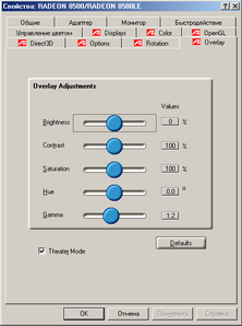 Карты на чипах RADEON предоставляют широкие возможности по коррекции цветов и гаммы оверлея (настройки будут доступны только при работающем оверлее). На скриншоте ниже изображена панель по настройке параметров оверлея. Для получения оптимального результата значения могут изменяться в зависимости не только от используемого дисплея и его настроек, но и от проигрываемого фильма.