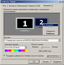 Рис.8. Расширение десктопа на второй монитор. В некоторых драйверах для RADEON есть возможность форсирования включения Theatre Mode при расширении десктопа на второй монитор, но, например, в драйверах CATALYST 2.3 этой возможности по умолчанию нет. Также во время тестирования на Windows XP был обнаружен забавный баг, проявляющийся при использовании увеличения в 9 раз:
