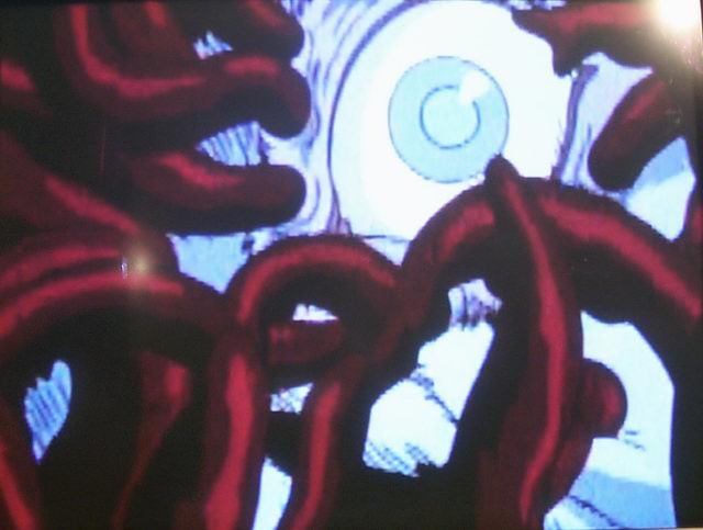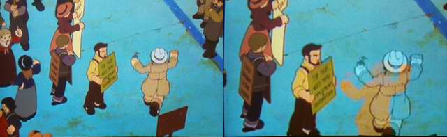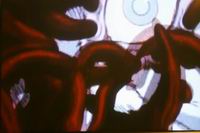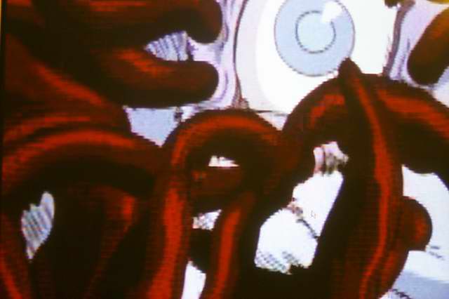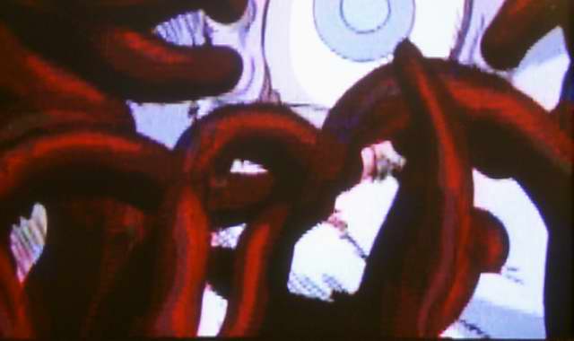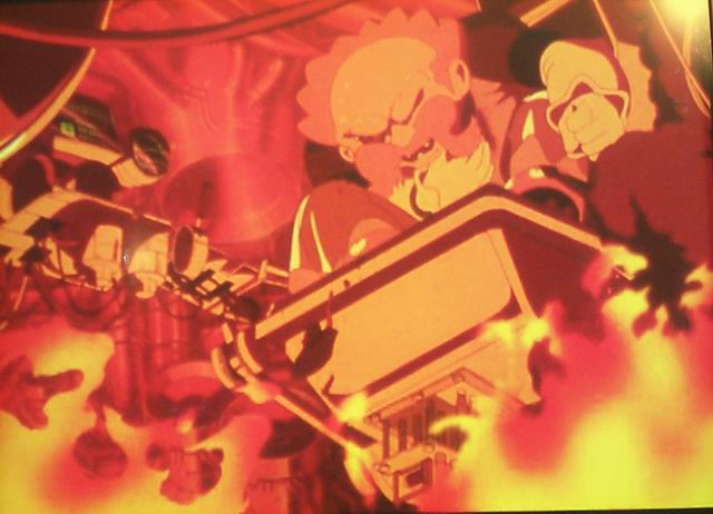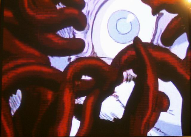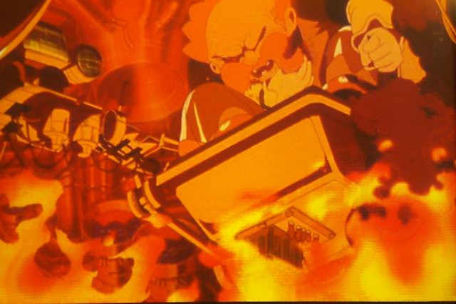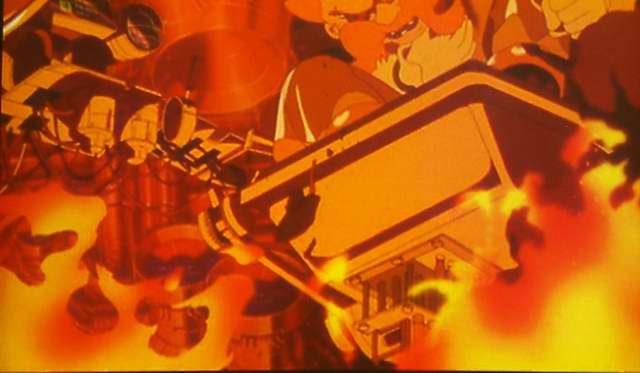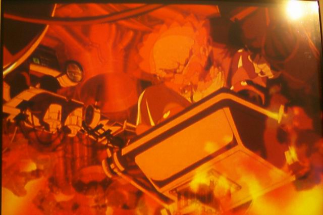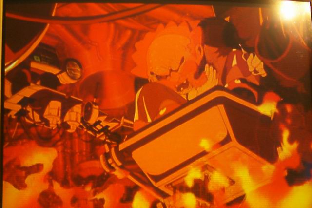 На сцене 4 увеличена в 9 раз центральная область кадра в эпизоде из аниме "Метрополис" (момент, когда повреждено "сердце" у Тимы и мигает красный свет). Здесь хорошее качество показывает на стоп-кадре только RADEON 9000, а в динамике  ещё и 7500. RADEON 8500 и 9700 тут (и вообще на подобных сценах) показывают неудовлетворительное качество адаптивного деинтерлейсинга даже в динамике.