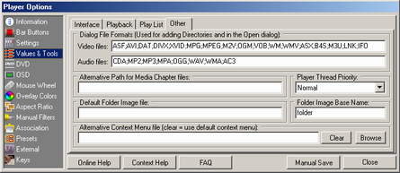 Рис.13. Панель по настройке фильтров в Zoom Player. Помимо вышеописанных операций, стоит в графе "Manual Filters" выбрать "Used Filter File", и затем в "Manual Filters File" выбрать "svcd". Теперь при проигрывании видео и использовании режима "Theater Mode" можно свернуть Zoom Player и продолжать смотреть видео на телевизоре. :-) И хочется предупредить ещё один вопрос тех, кто только начинает пользоваться Zoom Player - "Как воспроизвести скопированный на винчестер DVD ?" Для этого нужно зайти в настройки проигрывателя и выбрать сначала закладку "Values & Tools", а затем закладку "Other". Теперь смотрим, есть ли в поле "Video Files" надпись "IFO", если её нет, то добавляем так, как это показано на рисунке 14. Теперь при открытии диалога "Open Files" мы будем видеть файлы с расширением "IFO", для начала проигрывания содержимого DVD, скопированного на жёсткий диск, мы должны будем открыть файл "VIDEO_TS.IFO" в каталоге с содержимым DVD.