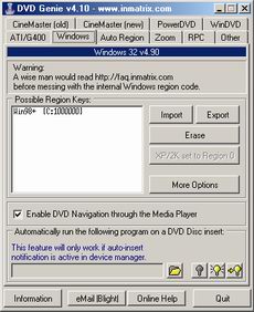 Рис.14. Программа DVD Genie служит для гибкой настройки параметров некоторых проигрывателей DVD. К сожалению, её автор, похоже, прекратил дальнейшую разработку и сосредоточился над совершенствованием Zoom Player. Тем не менее, эта программа всё ещё не потеряла своей актуальности из-за возможности поменять заданную зону в Windows 98SE/Millennium и PowerDVD и выставить в Windows 2000/XP нулевой регион (т.е. сбросить зону).