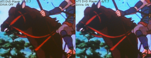 Рис.16. На левой картинке поводья у лошади смотрятся значительно хуже, чем на правой. Разница видна невооружённым глазом (в обоих случаях применялся weave деинтерлейсинг). В ATI DVD Player 7.8 такой проблемы нет, но включить использование DirectX VA в этом проигрывателе более проблематично, чем в предыдущих версиях (используется другой "движок", записи в реестре Windows тоже другие), в PowerDVD XP 4.0 и WinDVD 4.0 такой проблемы также не было замечено. На рисунке ниже показан процесс включения/выключения использования DirectX VA проигрывателем ATI версий 7.6 и 7.7: