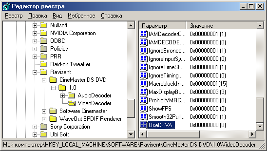 Рис.17. Включение/выключение использования API DirectX VA. Если значение ключа "0"  DXVA не используется, если "1"  DXVA используется.  Как выше уже писалось, качество адаптивного деинтерлейсинга зависит от применяемого алгоритма, при помощи которого определяются движущиеся части изображения. В своих новых графических чипах компания ATI не только вводила новые возможности по работе с 3D-графикой, но и изменяла алгоритмы, и, следовательно, и качество адаптивного деинтерлейсинга. В таблице 1 приведены скриншоты, демонстрирующие некоторые особенности деинтерлейсинга карт RADEON.