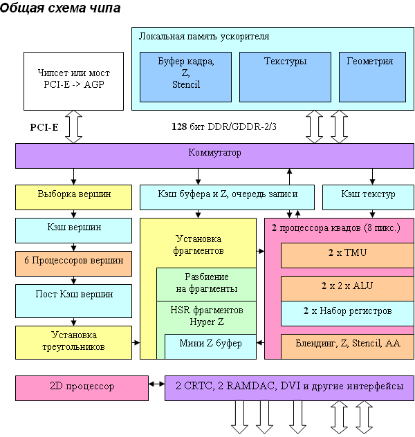 Итак, в наличии 6 (как и было — что потенциально является приятным сюрпризом для жадных до треугольников DCC приложений) вершинных процессоров, и два (было четыре) независимых пиксельных процессора, каждый из которых работает с одним квадом (фрагментом 2х2 пикселя). Как и в случае с NV43 PCI Express является нативным (т.е. реализованным на чипе) шинным интерфейсом, а AGP 8х платы (если такие случатся) будут содержать дополнительный мост PIC-E -> AGP (показан на схеме), который придется разработать и производить ATI.