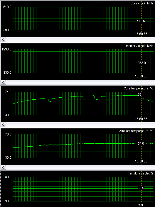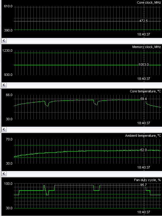 Теперь вернемся к температурам работы карты и шуму от ее кулера. Благодаря очередной оперативности автора RivaTuner Алексея Николайчука очередная внутренняя бета-версия утилиты уже поддерживает RV410. И, более того, способна не только менять и контролировать частоты карты, но и следить за температурами и частотой вращения вентилятора. Вот, что мы смогли увидеть при работе карты на штатных частотах без какого-либо внешнего охлаждения в закрытом корпусе: