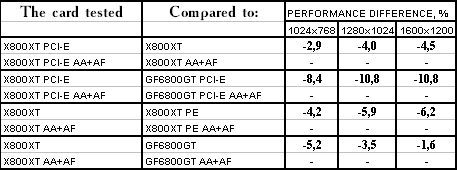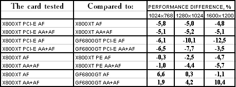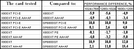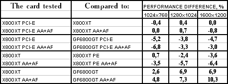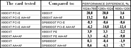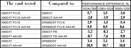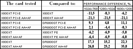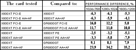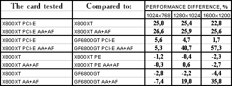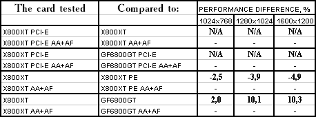 Поскольку теперь конкурентом GeForce 6800GT является не X800 PRO, а X800 XT, то будет интересно сравнить именно эти карты между собой.