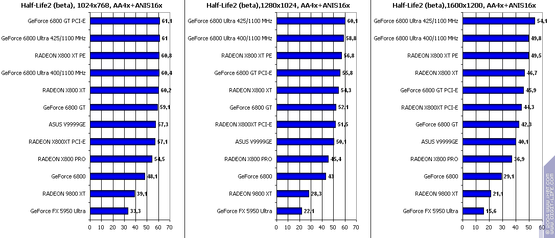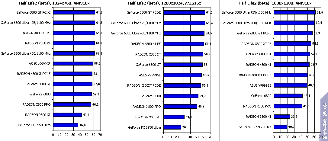 - Half-Life2 (Valve/Sierra) DirectX 9.0, demo (ixbt07. Тестирование проводилось при включенной анизотропной фильтрации, а также в тяжелом режиме с АА и анизотропией.