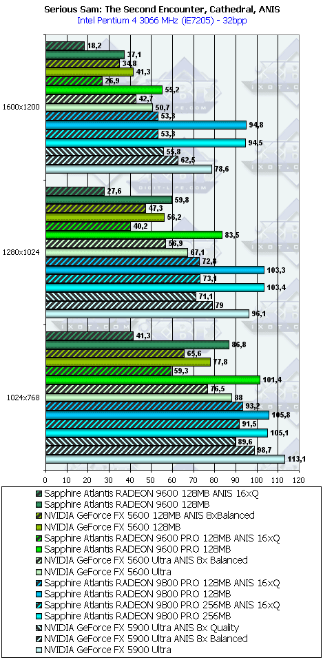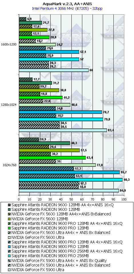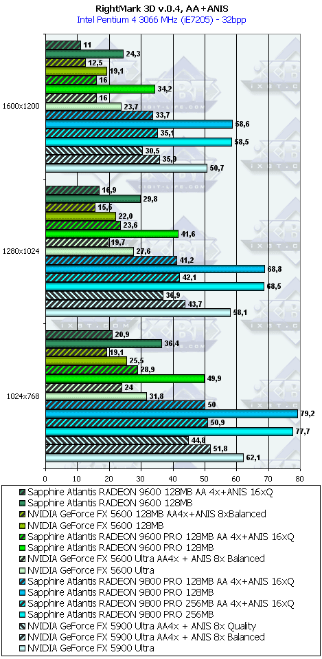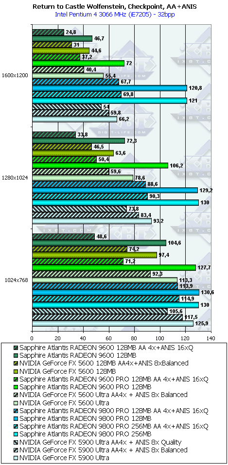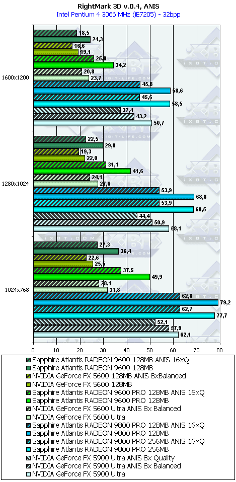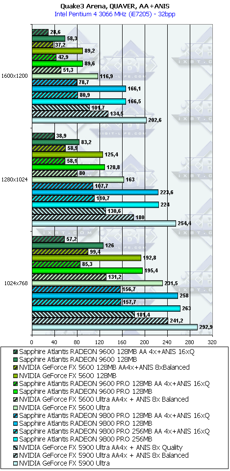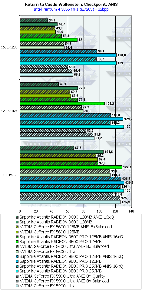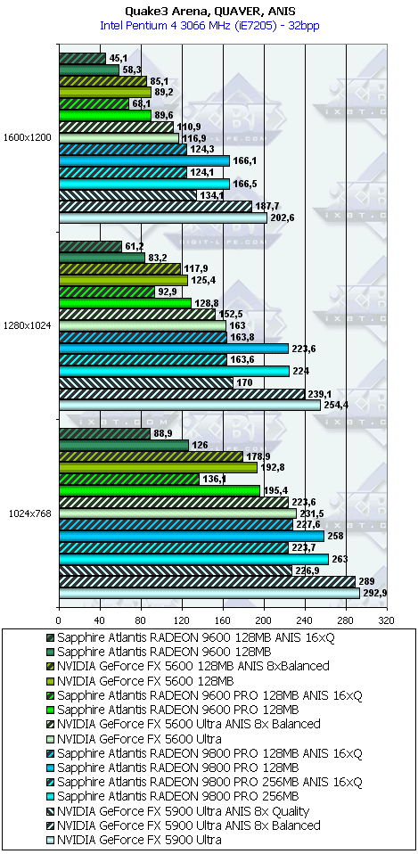 Что касается остальных карт, то картина разная: без АА и анизотропии все остальные RADEON 9600/9200 выигрывают