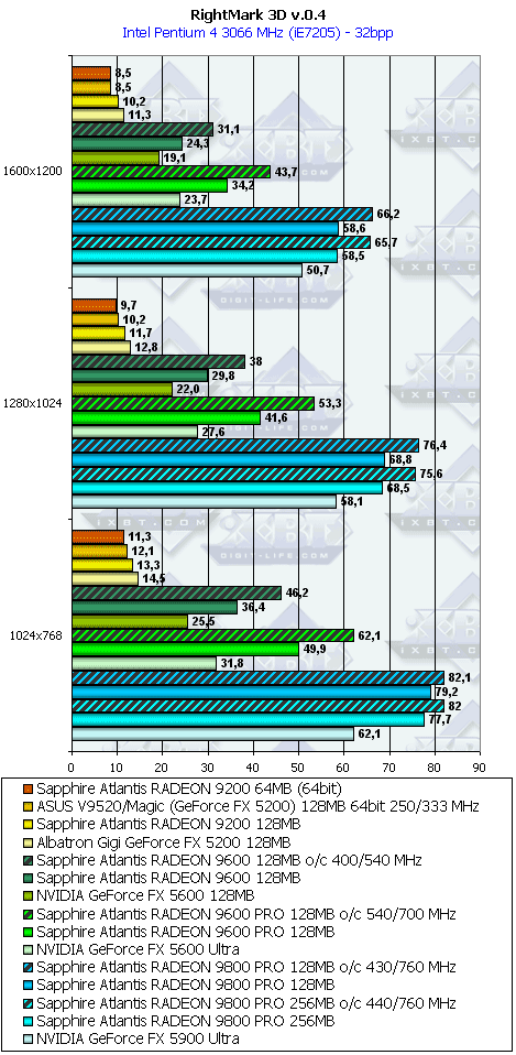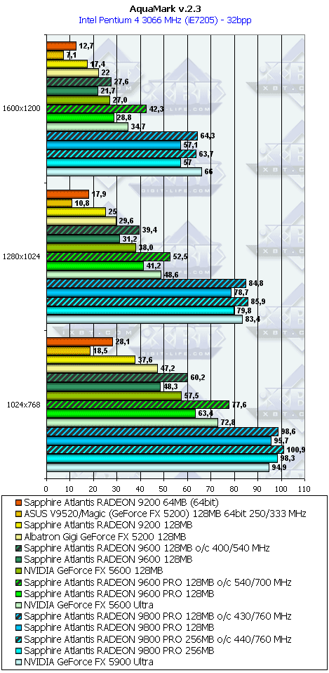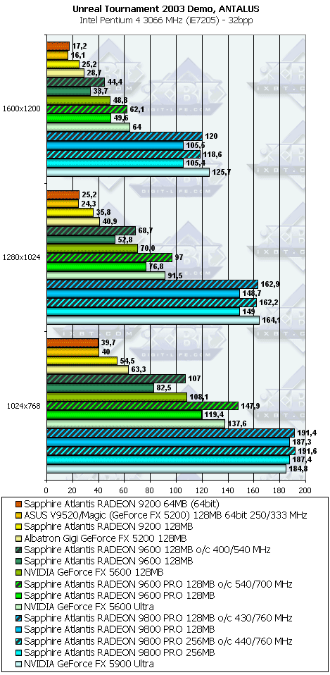 Аналогично. Только лишь RADEON 9200 64bit смог одержать уверенную победу на GF FX 5200 64bit.
