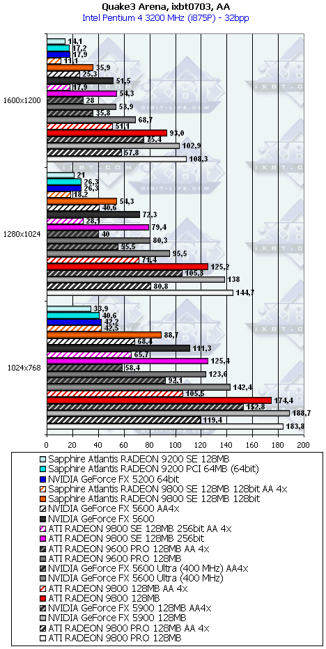 RADEON 9800 PRO Lite снова чуть отстает от обычного RADEON 9800 PRO. А также констатируем поражение от GeForce FX 5900.