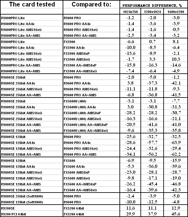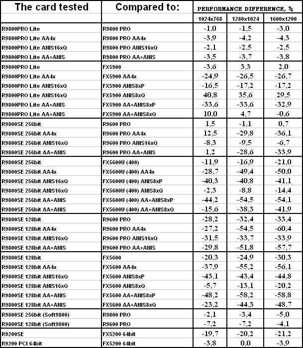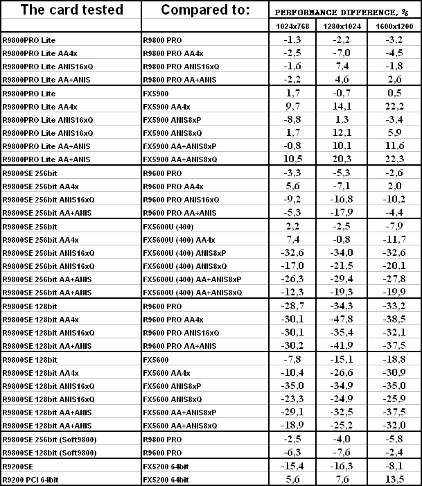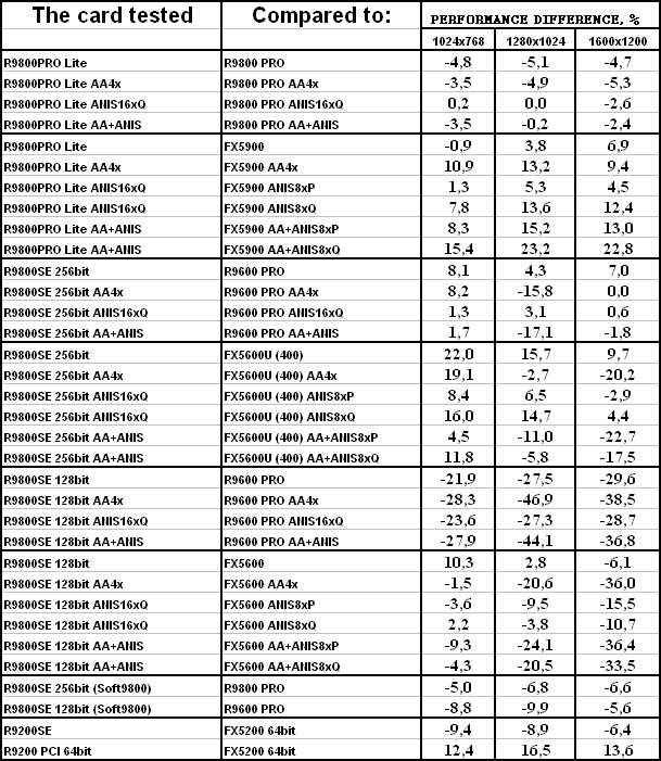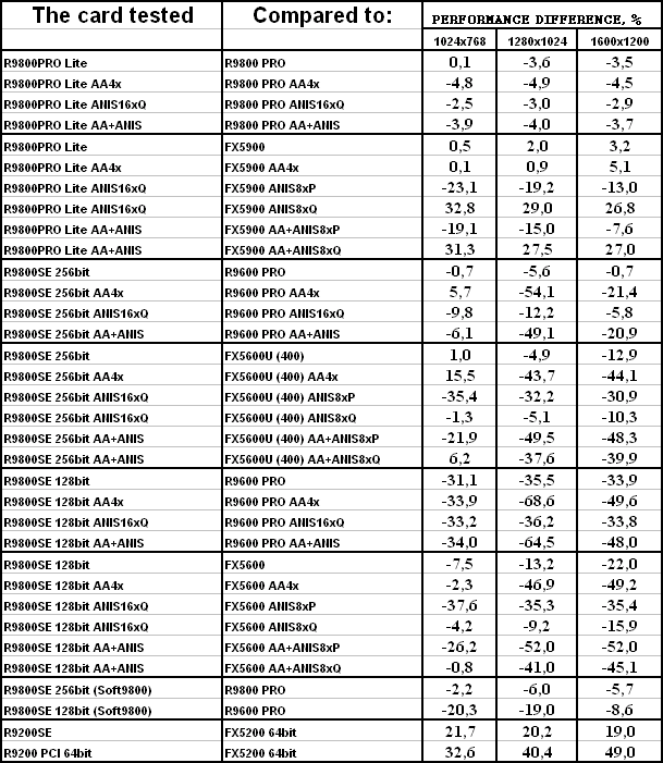 В целом RADEON 9800 PRO Lite почти равен обычному RADEON 9800 PRO, а также констатируем победу над GeForce FX 5900.
