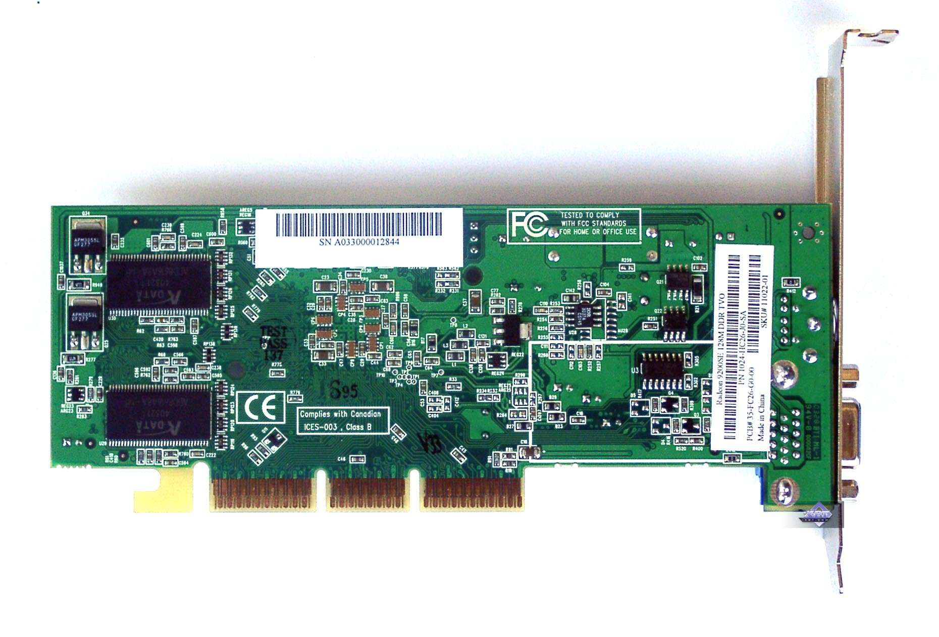 | Карта имеет интерфейс AGP x8/x4/x2, 128 МБ памяти DDR SDRAM, размещенной в 4-x микросхемах на лицевой и оборотной сторонах PCB. Микросхемы памяти A-Data. Время выборки у микросхем памяти 6 ns, что соответствует частоте работы 166 (333) МГц, на которой память и работает. Частота работы GPU 200 MHz. Шина обмена с памятью64бит. | ![]() |