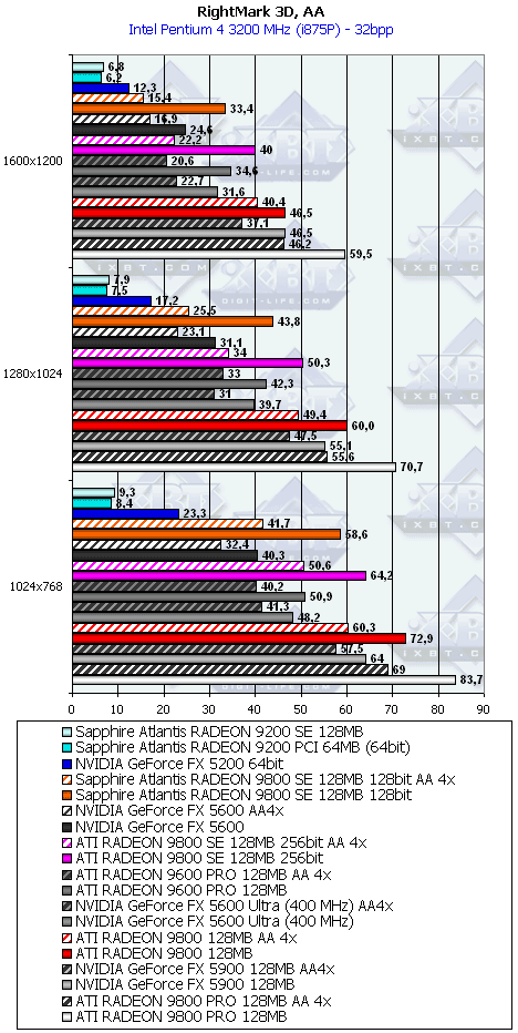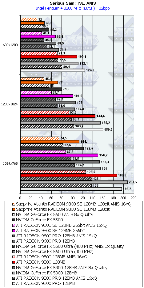 RADEON 9800SE со 128-битной шиной по-прежнему в проигрыше соперникам из одного ценового сектора. Однако разблокирование конвейеров помогло RADEON 9800SE обойти RADEON 9600 PRO и прилично.