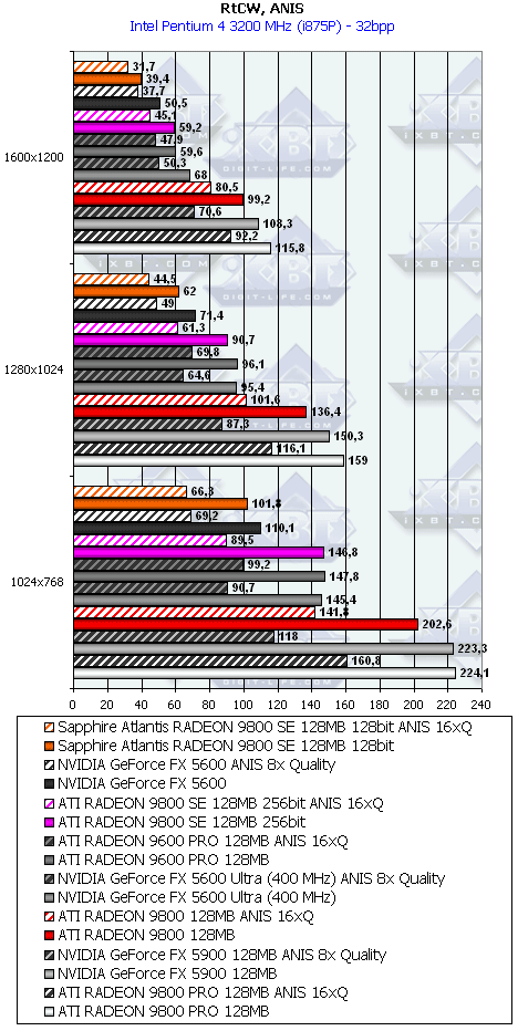 УНИКАЛЬНЫЙ случай! RADEON 9800SE с 256-битной шиной проиграла карте со 128-битной шиной на базе RADEON 9600 PRO именно в АА! Что-то явно тут не так с драйверами. Ну и как результат, самый тяжелый режим также проигран, как и поединок с GeForce FX 5600 Ultra (400 MHz). Разблокирование конвейеров привело к тому, что эта карта стала почти равной RADEON 9800 PRO.