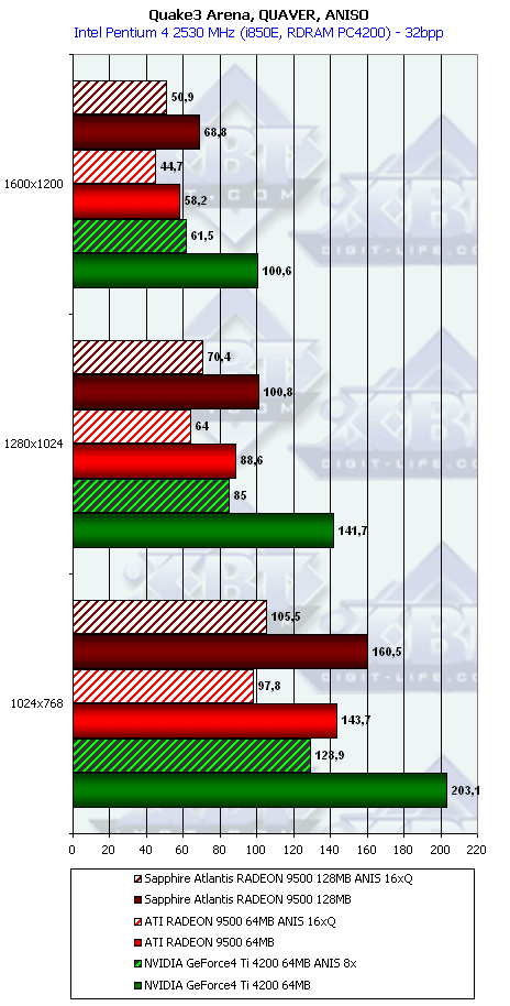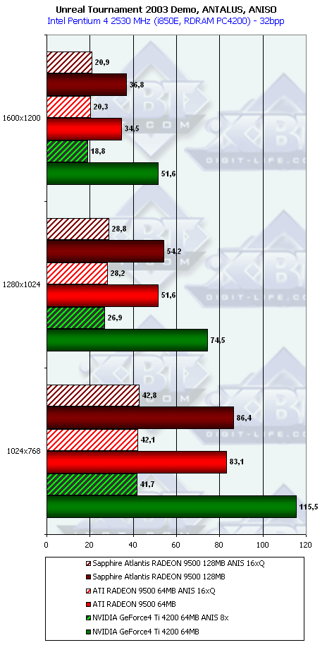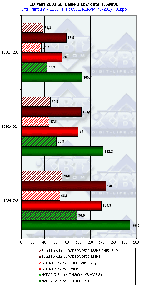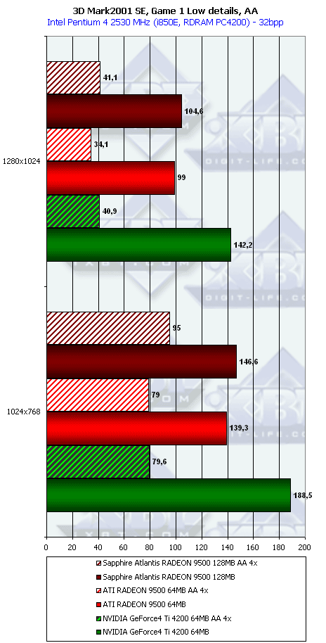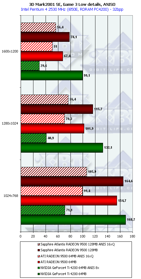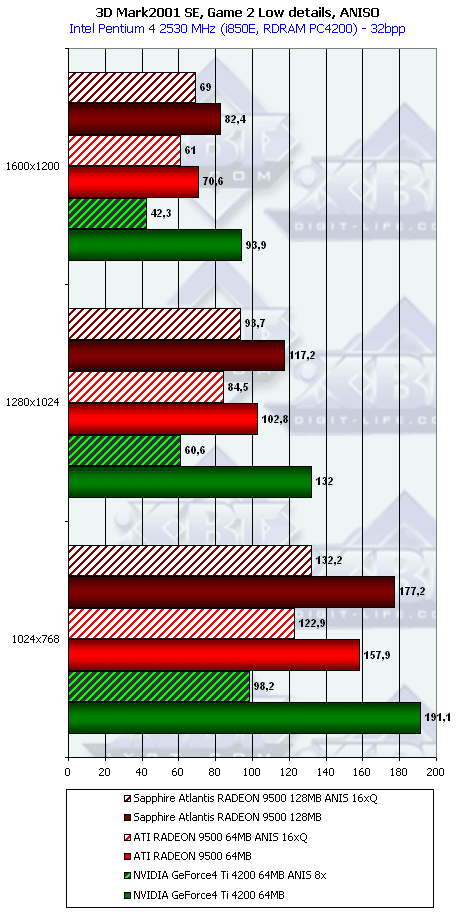 В самом конце этого списка есть наш обзор RADEON 9500, где мы познакомились с этим продуктом и выяснили, что по производительности он не так уж и хорош для своей цены в $140-150. И сделали вывод, что проигрыш карте на базе Ti 4200 во многих случаях нивелирует все плюсы поддержки DX9. А кроме того, кое-где RADEON 9500 проиграл конкуренту и в режимах с АА и анизотропией. И поэтому красная цена такой карте не выше $120.