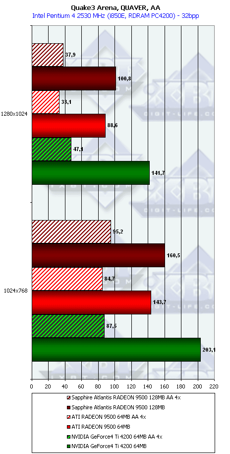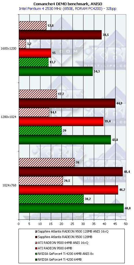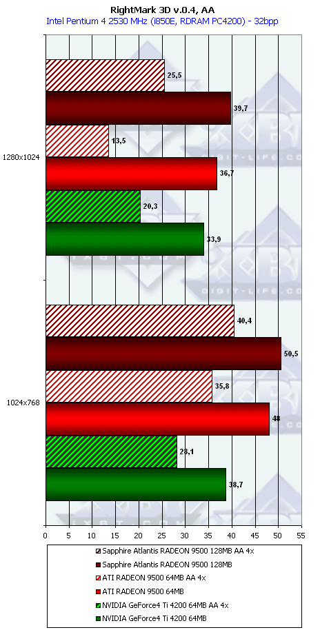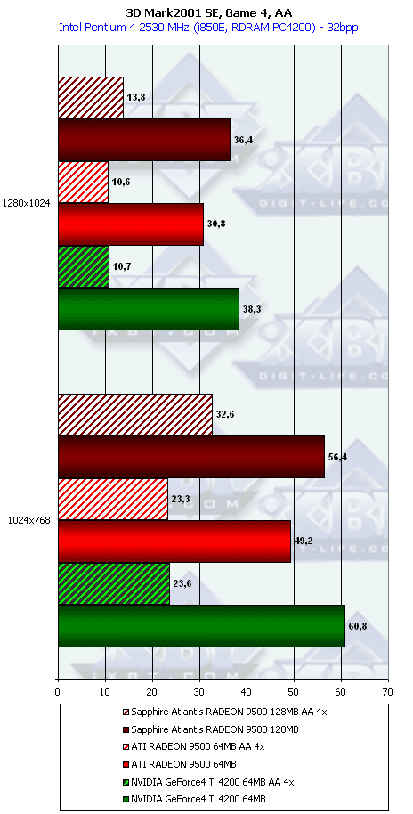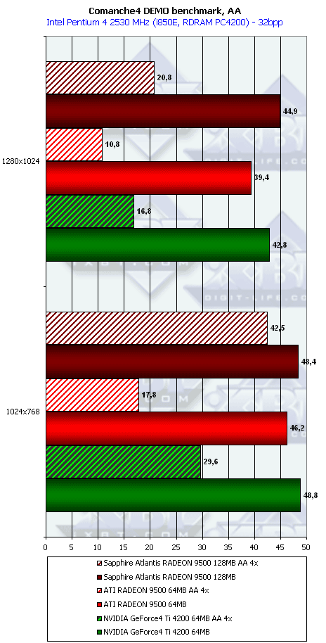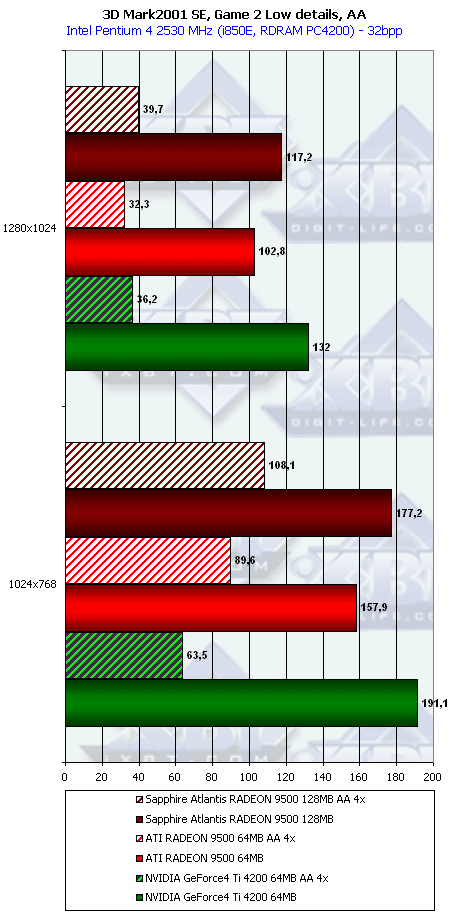 Очевидно, что даже такому слабому и крайне урезанному чипу наличие 256-битной шины помогает. Во всяком случае, мы видим, что в режимах с АА победа RADEON 9500 над конкурентом Ti 4200 очевидна. Мы пока не тестировали смешанный режим работы АА плюс анизотропия, но, думаю, что там новый продукт от ATI будет во всяком случае не хуже, чем его соперник в лице GeForce4 Ti 4200.