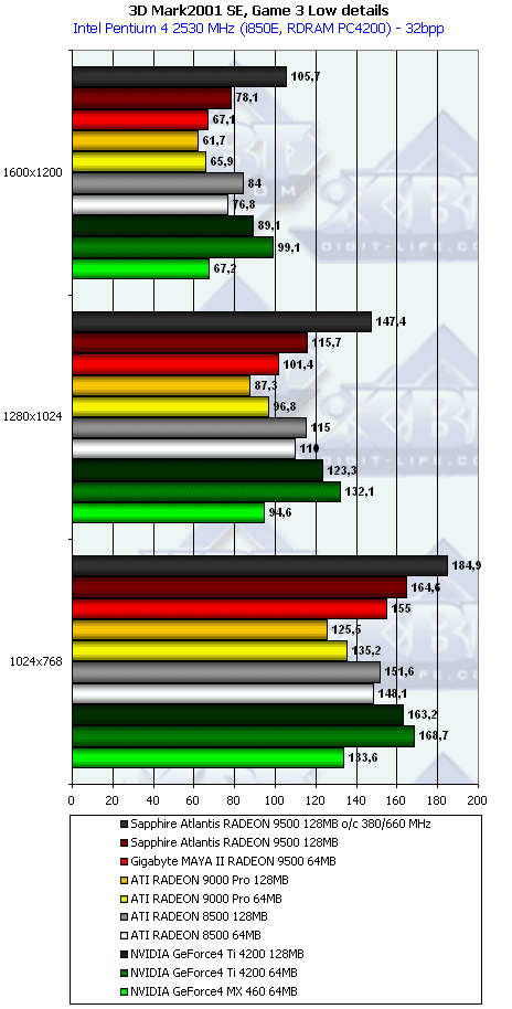 Пока не появится специально разработанный дизайн для карт на базе RADEON 9500 (а есть вероятность, что они никогда не появятся, ибо чем больше времени проходит, тем дешевле становится производство карт по существующему дизайну), надо понимать, что 64-х и 128-ми мегабайтные карты отличаются интерфейсом обмена с памятью: 128 и 256 бит. Это не может не отразиться на производительности, хотя индульгенция обманчива: слишком уж урезан VPU, даже 256-битная шина вряд ли поможет 4-х конвейерному чипу кардинально поднять скорость (но, как показали наши исследования ниже, рост производительности ощутим).