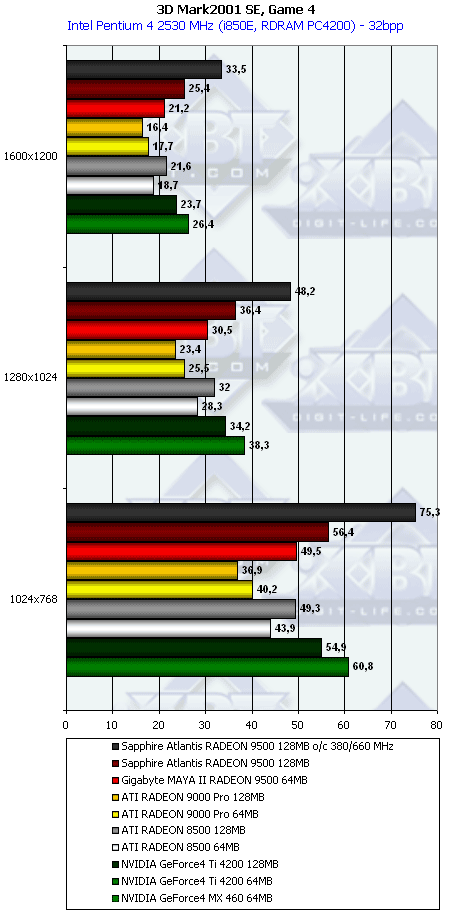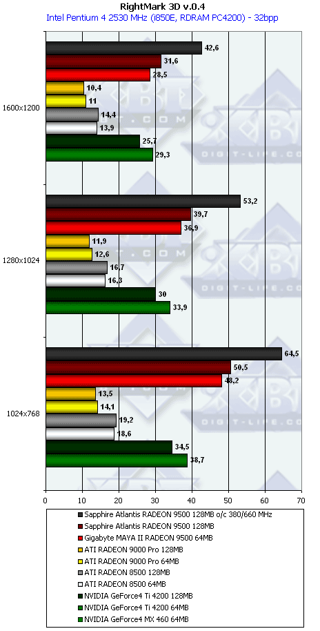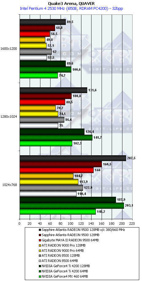 - Самый главный вывод: RADEON 9500 128MB весьма прилично быстрее своего 64-мегабайтного аналога, здеусь уже можно говорить о том, что он прямой конкурент GeForce4 Ti 4200 по скорости, а в тяжелых режимах даже быстрее, несмотря на урезанность графического процессора. И не надо забывать о поддержке DirectX 9.0, чего нет у Ti 4200.