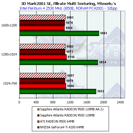 В режиме мультитекстурирования, когда чипу позволено использовать все свои возможности по работе с текстурами, падения производительности при переходе в АА2х вообще нет! Что и требовалось доказать насчет наличия 256-битной шины у данной карты!