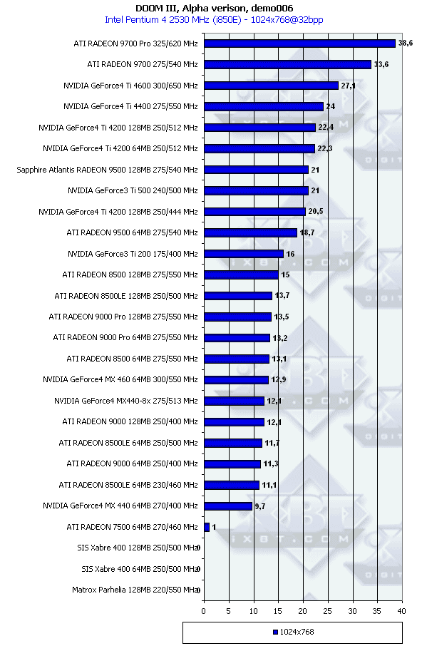 Мы решили протестировать массу видеокарт в альфа-версии будущего хита DOOM III, не так давно "утекшей в Сеть". Хотя в комплекте с этой полу-игрой есть своя демо, мы решили воспользоваться любезно предоставленными сотрудниками информационного ресурса 3DNews.ru двумя демо. Это demo002 и demo006. За подробностями относительно того, как и где их взять просим обращаться на сайт 3DNews, где есть обзор DOOM III v.0.02, в котором указанные demo принимали участие.