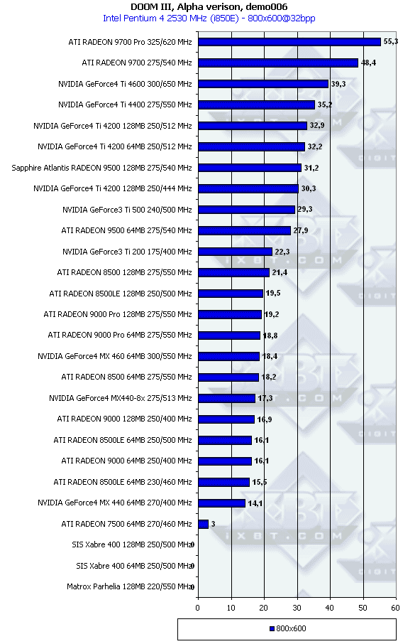 Полагаю, что комментировать нечего, кроме разве что добавлений, что SIS Xabre на демо006 "вырубил освещение", и игрок бегал в полутьме, что не засчитывается. Matrox Parhelia выдал нечто вроде абстрактных картин, где нельзя понять где игрок и что происходит, поэтому также его результат не засчитывается. KYRO II просто не запускается на этой игре (выдает ошибку и выходит в систему).