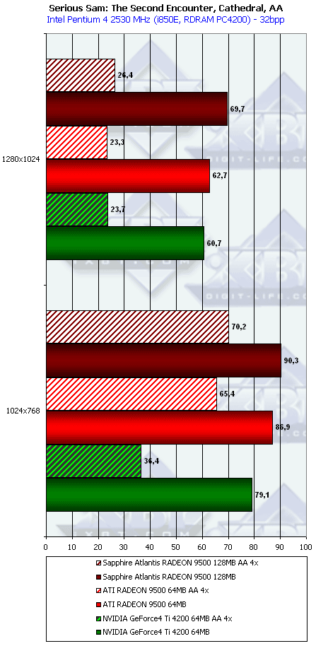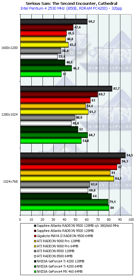 - Serious Sam: The Second Encounter v.1.05 (Croteam/GodGames) OpenGL, мультитекстурирование, Grand Cathedral demo, настройки тестирования: quality, S3TC OFF