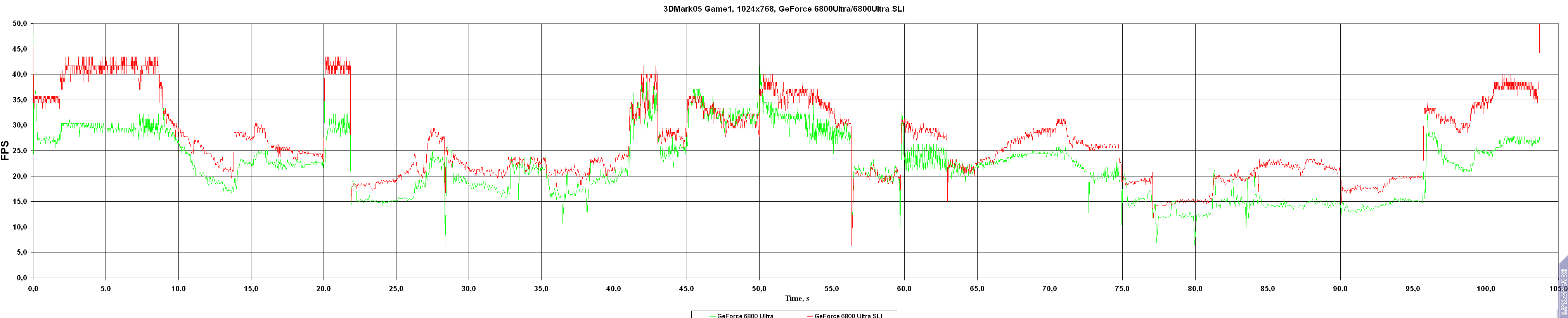 Частоты работы GeForce 6800 Ultra получались разгоном карт GeForce 6800GT (ДО УСТАНОВКИ SLI!) каждой в отдельности.