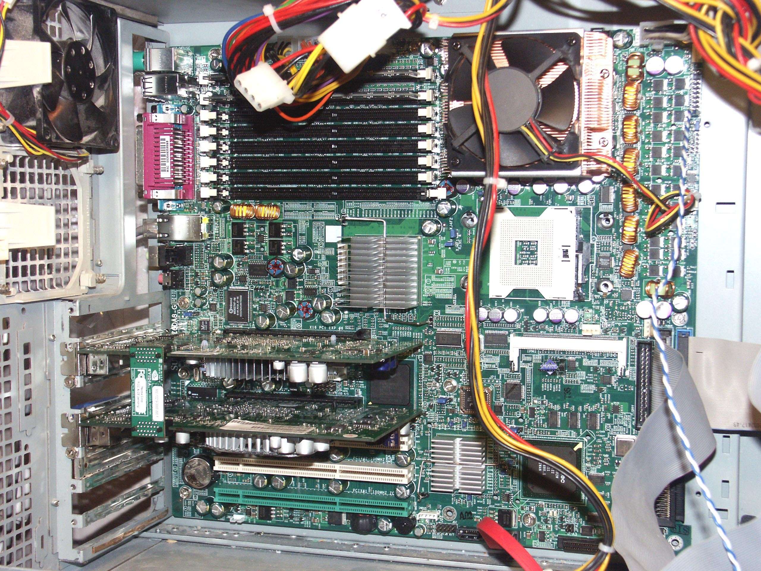 Примечание: прошу не удивляться, что на снимках видны разные вентиляторы на CPU. Штатный вентилятор был такой шумный, что даже голова начала болеть (сильный свист на высоких частотах), поэтому пришлось его снять и временно установить обычный вентилятор от БП, который успешно обдувал медный радиатор без всякого шума, при этом последний был почти холодным (зачем ставить 7000-оборотный и очень шумный вентилятор на такой радиатор?).