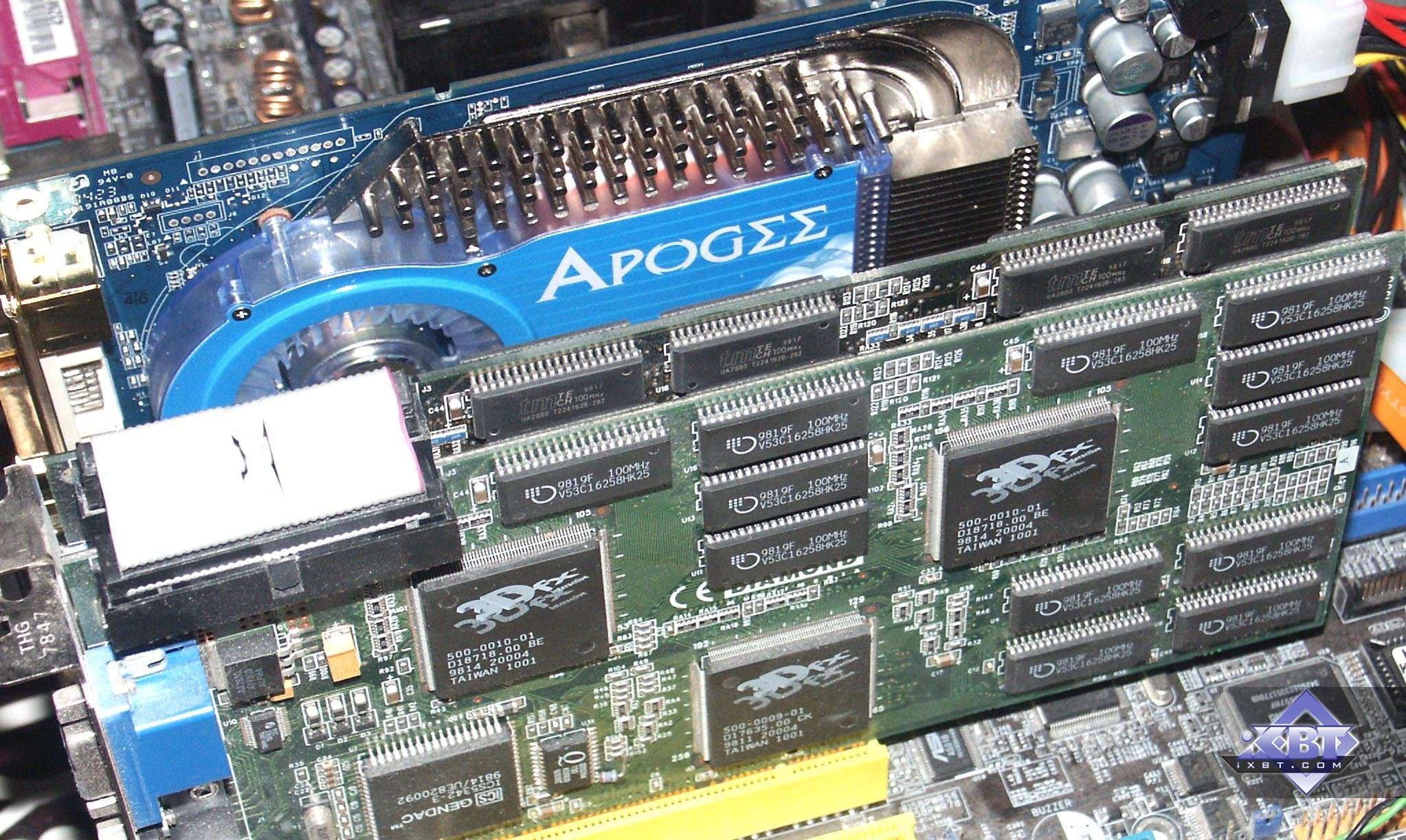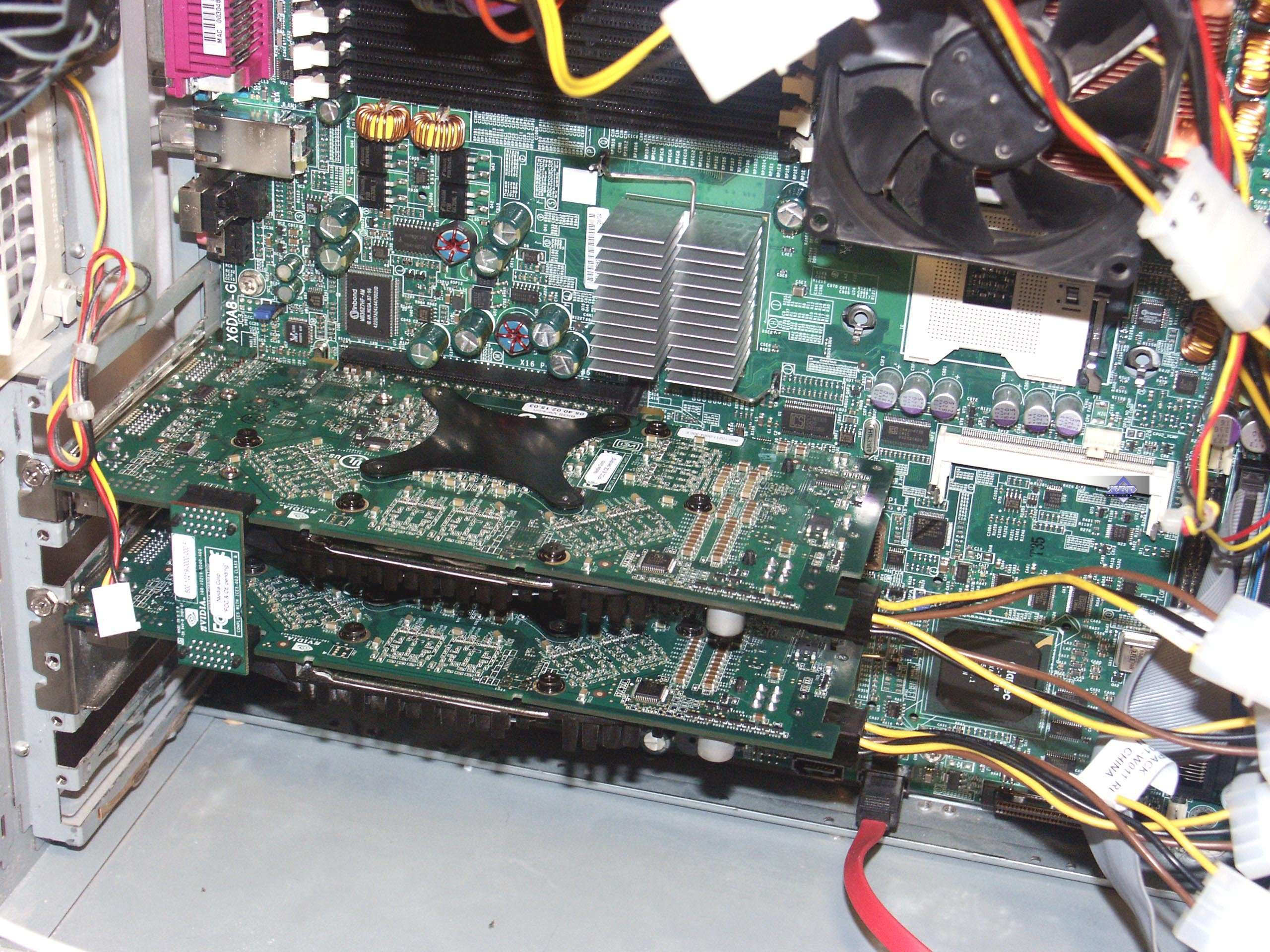 Заметим, что внутри соответствующих чипов (NV45, NV43) имеется специальный блок, отвечающий за SLI, он работает с общими ресурсами для двух плат. Обмен данными производится по шине, а синхронизация — через специальный переходник-коммутатор, одеваемый на обе карты (см. на снимках ниже).