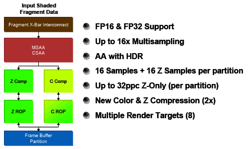 - 6 широких блоков ROP (24 пикселя) c поддержкой режимов антиалиасинга до 16 семплов на пиксель в том числе при FP16 или FP32 формате буфера кадра (т.е. возможны HDR+AA). Каждый блок состоит из массива гибко конфигурируемых ALU и отвечает за генерацию и сравниение Z, MSAA, блендинг. Пиковая производительность всей подсистемы до 96 MSAA отсчетов (+ 96 Z) за такт, в режиме без цвета (Z only) - 192 отсчета за такт.