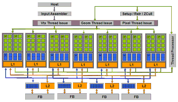 Схема шейдерных блоков и оценка их пиковой вычислительной производительности G80 приводилась в соответствующей статье, для G92 она не изменилась, их производительность пересчитать несложно, исходя из изменений в тактовой частоте. ALU в чипах работают на более чем удвоенной частоте, они скалярные, что позволяет добиться высокого КПД. Про функциональные отличия пока что неизвестно, доступна ли точность расчетов FP64 в этом чипе или нет. Точно есть поддержка вычислений в целочисленном формате, а при реализации всех вычислений соблюден стандарт IEEE 754, важный для научных, статистических, экономических и других расчетов.