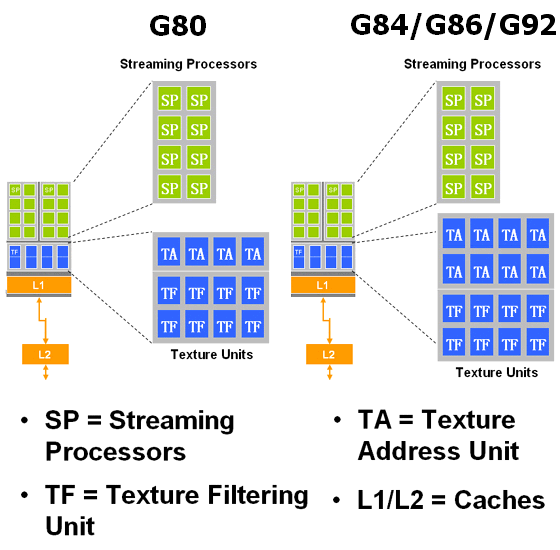Архитектурно G92 от G80 отличается не сильно. По тому, что нам известно, можно сказать, что G92 это флагман линейки (G80), переведенный на новый техпроцесс, с небольшими изменениями. NVIDIA указывает в своих материалах, что чип имеет 7 больших шейдерных блоков и, соответственно, 56 текстурных блоков, а также по четыре широких ROP, число транзисторов в чипе вызывает подозрения о том, что они что-то не договаривают. В анонсированных изначально решениях задействованы не все блоки, существующие в чипе физически, их количество в G92 больше, чем активных в GeForce 8800 GT. Хотя увеличенная сложность чипа объясняется включением в его состав ранее отдельного чипа NVIO, а также видеопроцессора нового поколения. Кроме того, на количество транзисторов повлияли и усложненные блоки TMU. Также, вполне вероятно, были увеличены кэши для увеличения эффективности использования 256-битной шины памяти.