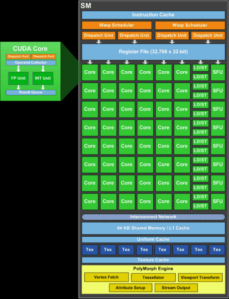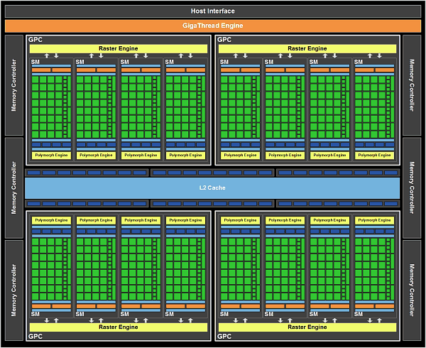 Зато скорость самой тесселяции у нового чипа должна быть всё же выше, чем у того же Radeon HD 5770 (а возможно и HD 6850), ведь эта работа распределяется между четырьмя движками PolyMorph, в отличие от одного выделенного блока тесселяции (хотя и более производительного) у конкурентов. Это может сказаться в таких новых DirectX 11 играх с поддержкой тесселяции, как HAWX 2.
