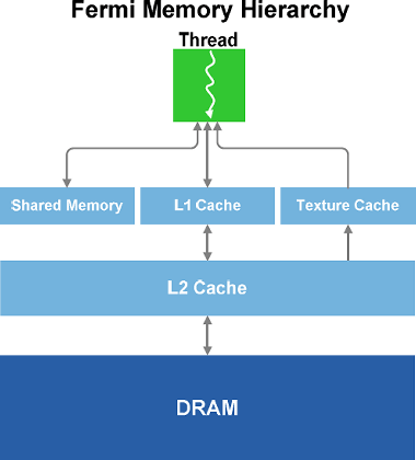 Каждый мультипроцессор в GF110 имеет 64 килобайта начиповой памяти, которая может быть сконфигурирована в двух разных вариантах: 48 килобайт общей памяти и 16 килобайт L1 кэш-памяти, или наоборот — 16 КБ общей памяти и 48 КБ кэша. Кроме этого, GF110 имеет 768 КБ унифицированной кэш-памяти второго уровня, которая обслуживает все запросы по загрузке и сохранению данных, а также текстурные выборки.