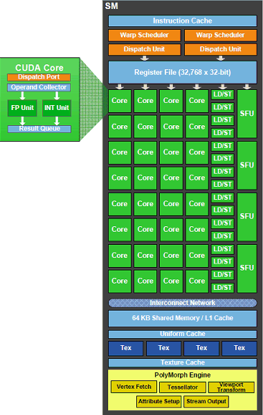 GeForce GTX 560 Ti использует ту же конфигурацию мультипроцессоров Streaming Multiprocessor, что и GTX 460. В применённом GF114 используются потоковые мультипроцессоры с увеличенным количеством вычислительных ядер (CUDA cores) в каждом, по сравнению с топовыми чипами текущей архитектуры. В общем, каждый SM имеет 48 потоковых процессоров, четыре диспетчера и восемь блоков TMU.