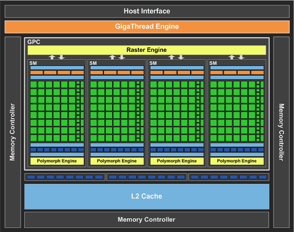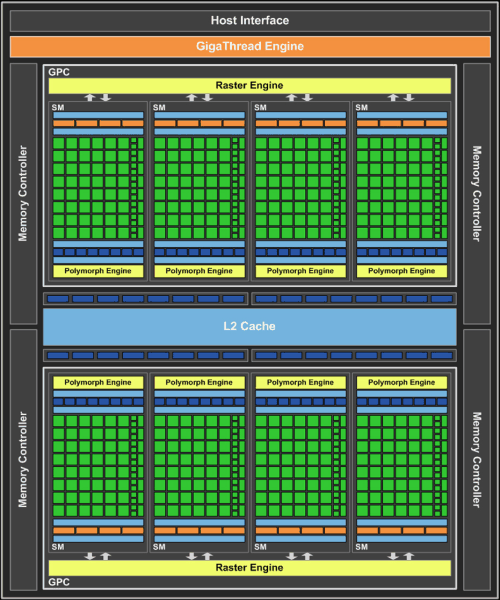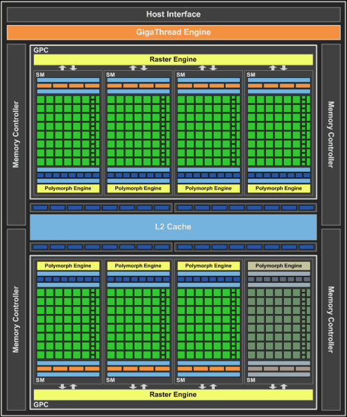 - 16 потоковых мультипроцессоров, включающих 512 скалярных ALU для расчётов с плавающей точкой (поддержка вычислений в целочисленном формате, с плавающей запятой, с FP32 и FP64 точностью в рамках стандарта IEEE 754-2008)