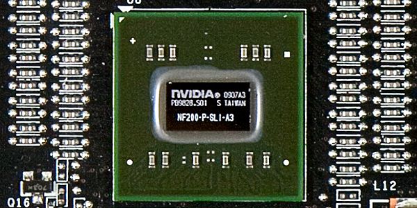Возможности слота PCI-Express 2.0 x16 по максимальной пропускной способности (до 8 гигабайт в секунду) делятся на два GPU при помощи специального чипа — PCI-Express коммутатора NF200, который применялся ещё со времён GeForce GTX 295. Этот коммутатор даёт каждому GPU по 16 каналов PCI-E, но уже с вдвое меньшей пропускной способностью. В отличие от AMD, использующей решения PLX со своей маркировкой, NVIDIA применяет собственные давние разработки.