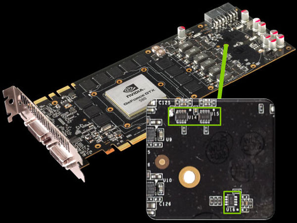 Для защиты видеокарты и всей системы от повреждений, связанных с превышением возможностей линий питания, референсная видеокарта GeForce GTX 560 Ti использует уже знакомые нам технологии мониторинга, введённые в GeForce GTX 580. Эти элементы аппаратного мониторинга наблюдают за силой тока и напряжением на 12-вольтных линиях питания (PCI-E и 6-штырьковые дополнительные разъемы), драйвер опрашивает значения параметров и может снизить тактовую частоту GPU.