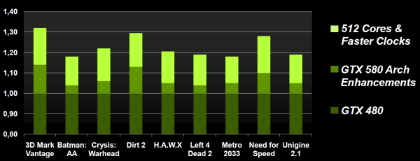 Подобное повышение теоретических характеристик вызывает рост практической производительности рендеринга в играх, особенно в случаях, когда скорость ограничена ПСП видеопамяти. Судя по тестам самой NVIDIA, при типичных для GTX 550 Ti настройках (1680x1050 и MSAA 4x), одно только расширение шины до 192-бит даёт порядка 14% в среднем, а в случае некоторых игр даже выше (StarCraft II — 31%, Aliens vs Predator — 23%, Batman: Arkham Asylum — 21%).
