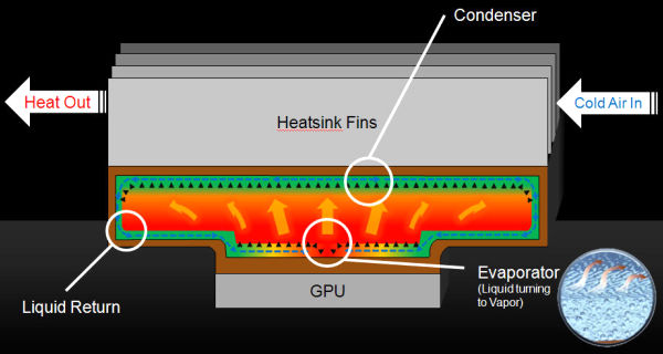 Эффективное охлаждение столь горячего двухчипового решения — это даже ещё более сложная задача. И NVIDIA отлично с ней справилась! Важным преимуществом GeForce GTX 590, которое особенно выделяет компания, является низкий уровень шума от устройства её охлаждения. На плату установлен высокоэффективный кулер с двумя испарительными камерами на каждый GPU и низкоскоростным вентилятором с крыльчаткой большого диаметра (90 мм).