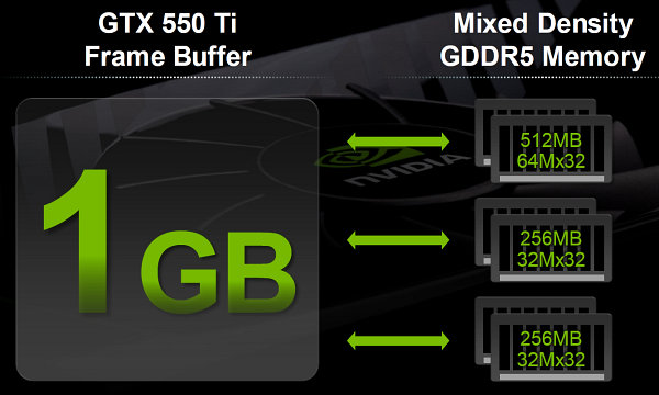 Но даже это ещё не всё. В GF116 изменились не только частоты и ширина шины. Как вы помните из технических характеристик решения, при 192-битной шине памяти GTX 550 Ti каким-то образом содержит ровно 1 гигабайт видеопамяти, хотя обычно в таких случаях должно получаться 768 или 1536 МБ. Если использовать одинаковые микросхемы GDDR5, конечно.