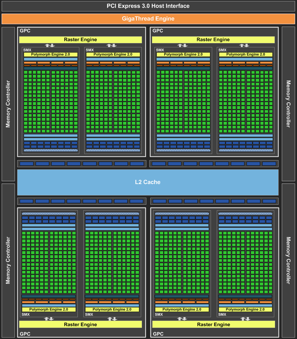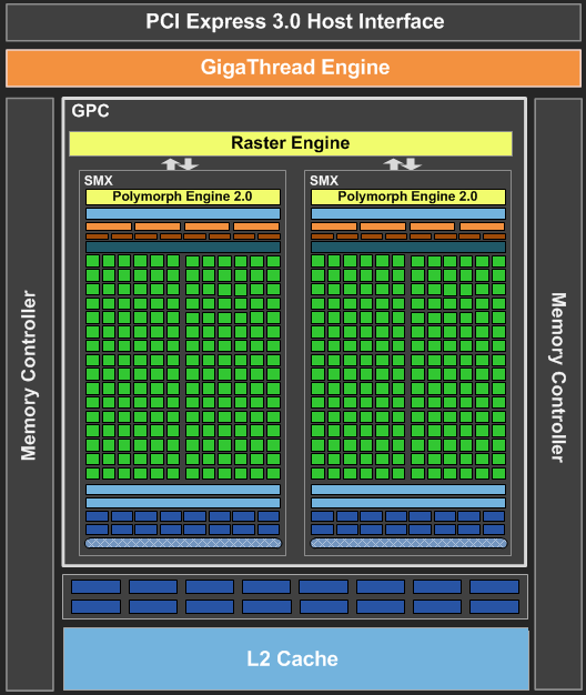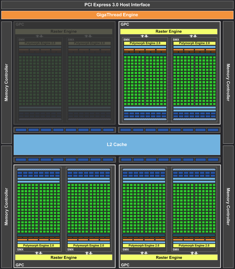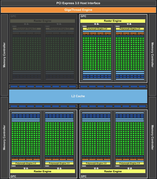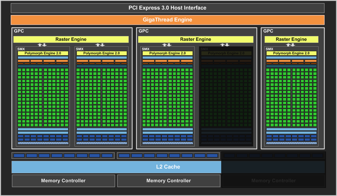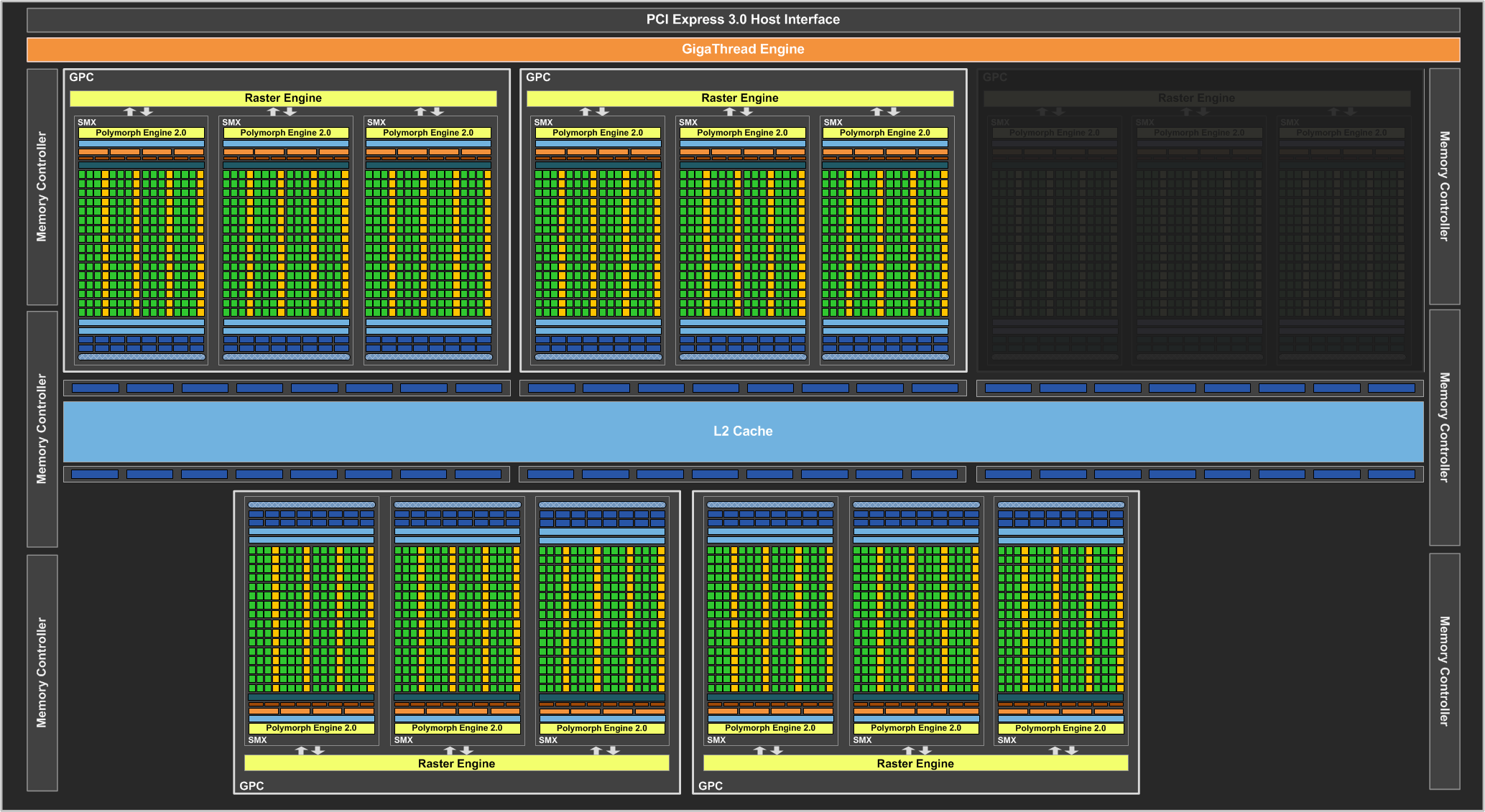 - 8 потоковых мультипроцессоров, включающих 1536 скалярных ALU для расчётов с плавающей запятой (поддержка вычислений в целочисленном формате, с плавающей запятой, с FP32 и FP64 точностью в рамках стандарта IEEE 754-2008);